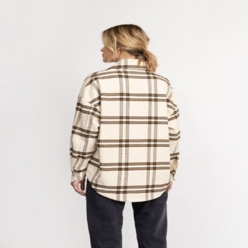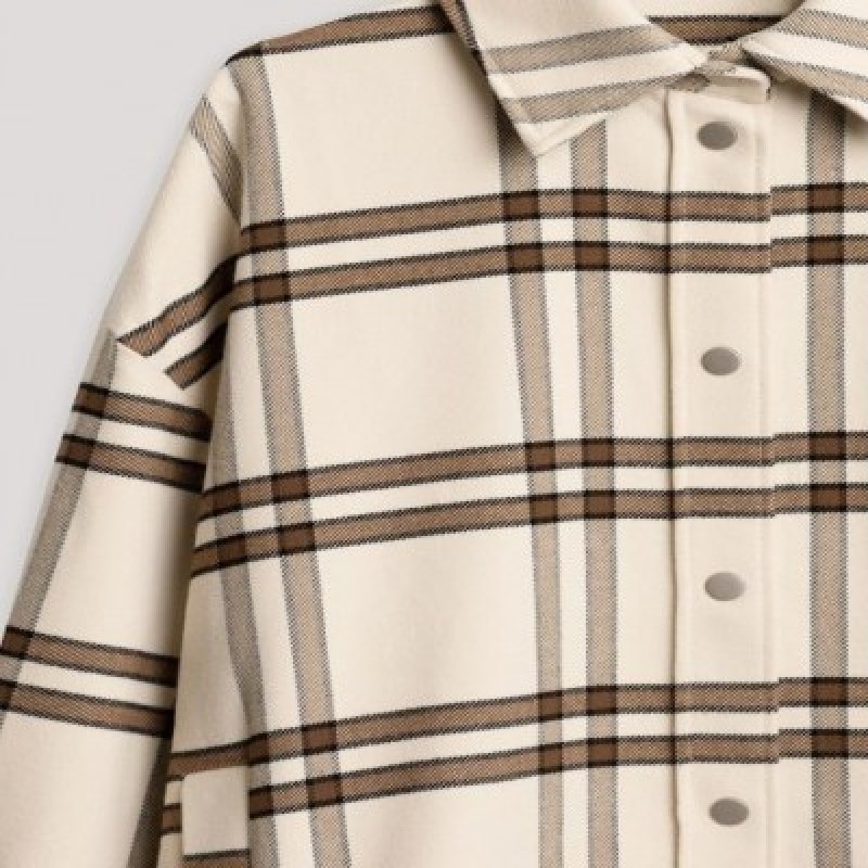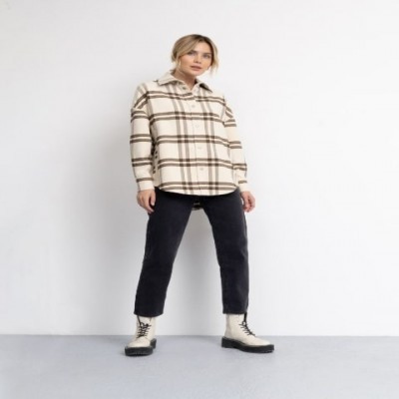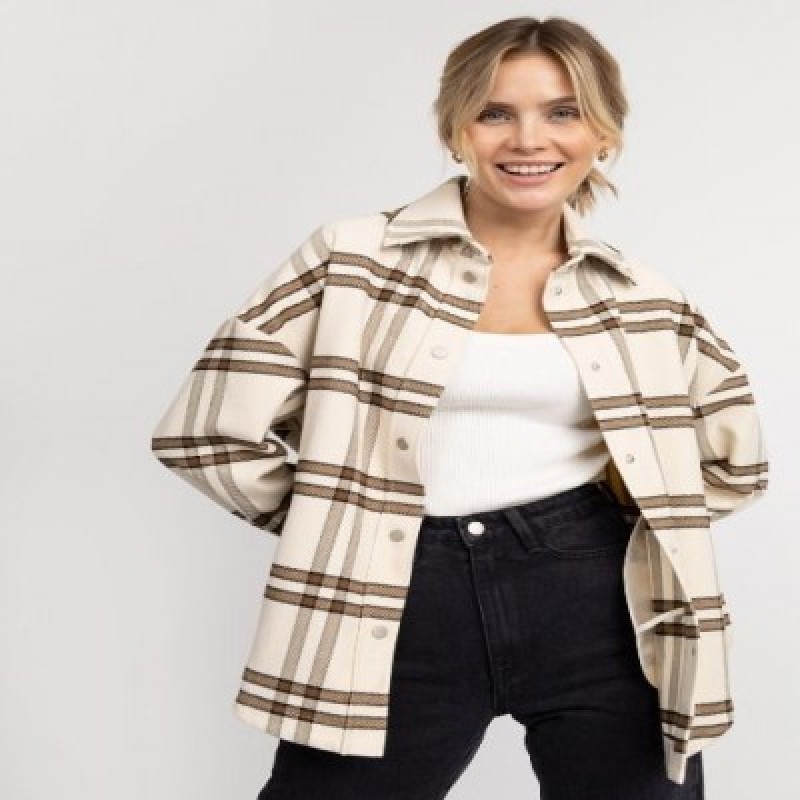 Лаконичная бежевая рубашка в крупную коричневую клетку- это одновременно элегантный и свободный трендовый аутфит этого сезона. Женская рубашка изготовлена из мягкой фланелевой ткани с небольшим ворсом, которая дарит невероятные тактильные ощущения, уютно обволакивая тело. Повседневная молодежная модель комфортного прямого силуэта со спущенной линией плеч открывает полную свободу движений. Спереди клетчатой рубашки в английском стиле расположены вместительные прорезные карманы. Теплая рубашка фиксируется на удобные металлические кнопки. Длинные рукава повседневной рубахи с защипами и широкими манжетами на кнопках надежно застегиваются. Стильная рубашка из смесовой ткани с отложным воротником- универсальная вещь для прогулок, загородных поездок, путешествий, отпуска и в качестве демисезонного варианта верхней одежды.Рубашку можно носить самостоятельно, в качестве пиджака или создавать с помощью неё интересные многослойные сочетания с трикотажными футболками, топами или водолазками.