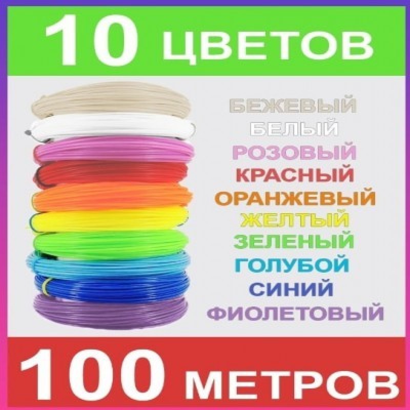 Комплектацияпластик для 3д ручки; пластик для 3D ручки; набор пластика для 3д печати 100 метров: 10 цветов по 10 метров