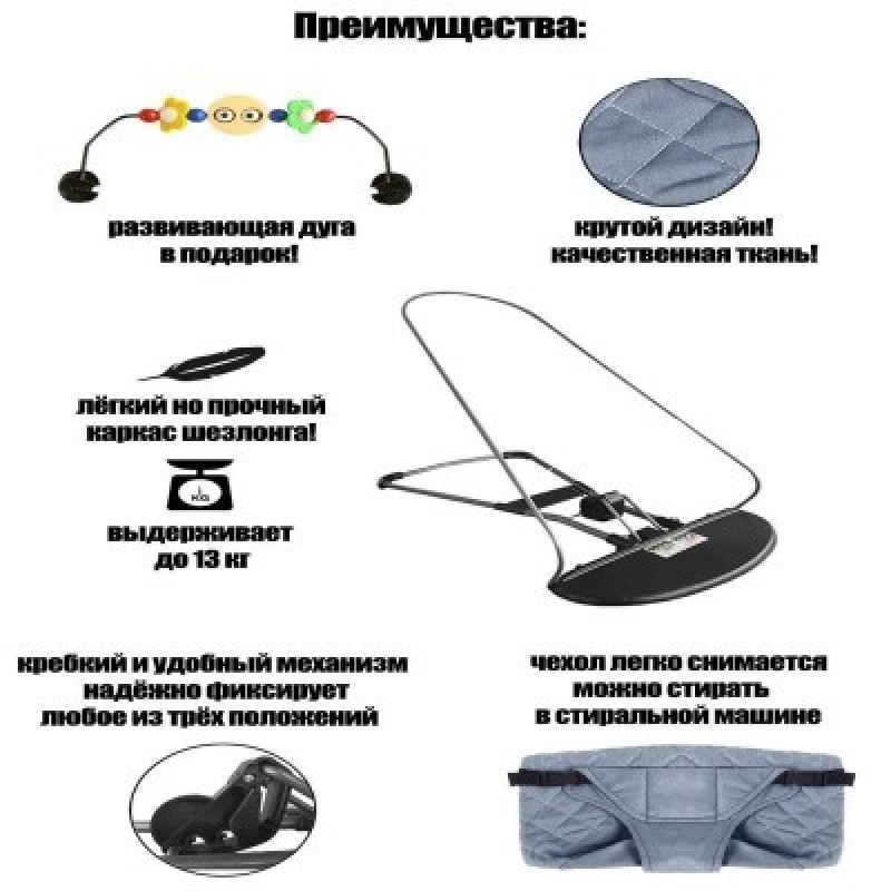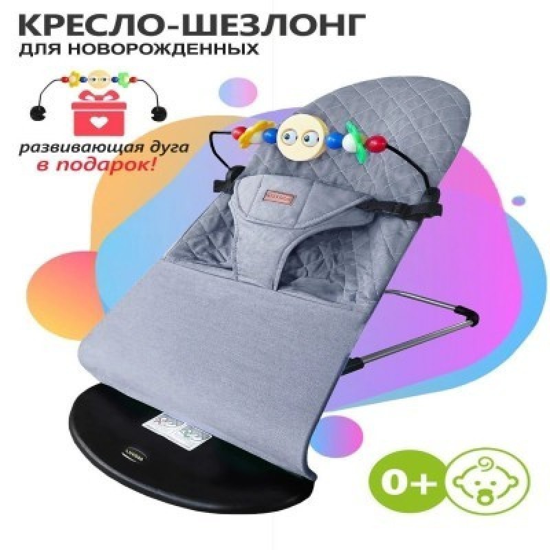 Детский шезлонг - идеальное решение для родителей новорожденных,которые хотят обеспечить своему малышу комфорт и безопасность. Этот шезлонг имеет регулируемую спинку, что позволяет подобрать оптимальное положение для ребенка, этим свойством детский шезлонг очень похож на кресло-качалку. Он также оснащен мягкой и удобной подушкой, которая обеспечивает оптимальную поддержку головы и спины младенца.К шезлонгу прилагается дуга с комплектом игрушек, чтобы ребёнок находился в шезлонге с интересом и большее время.Чехол шезлонга выполнен из хлопка,который легко стирается и не потеряет своих качеств даже спустя долгое время.Детский шезлонг выполнен из высококачественных материалов, которые не вызывают аллергических реакций и обеспечивают хорошую вентиляцию. Кроме того, он легкий и компактный, что позволяет легко перемещать его по дому.Этот шезлонг имеет надежную конструкцию с устойчивыми ножками, что предотвращает его перекашивание и обеспечивает безопасность ребенка. Кроме того, он оснащен ремнями безопасности, которые предотвращают выпадение малыша из шезлонга.Детский шезлонг - идеальное место для отдыха и развлечений младенца. Он позволяет ребенку наблюдать за окружающим миром, а также помогает развивать его координацию и силу мышц. Мягкий и уютный материал шезлонга создает атмосферу комфорта и спокойствия для малыша.Выбирая детский шезлонг, родители получают надежное и удобное место для отдыха своего малыша!Данный детский шезлонг станет отличным приобретением на выписку из роддома или любой паре, в семье которых появился новорожденный!