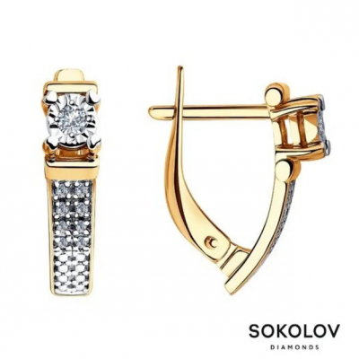 Женские золотые серьги с бриллиантами. Стильные дизайнерские серёжки с классическим английским замком отлично подходят для повседневной носки, а также эффектно дополнят нарядный, вечерний, праздничный или свадебный образ. Современные ювелирные изделия легко сочетаются с любой одеждой. Украшения SOKOLOV (Соколов) приходят в комплекте с подарочной упаковкой, идеально подходят для подарка любимой женщине, девушке, девочке на День рождения, Новый год, 8 марта, день всех влюбленных (14 февраля) или любой праздник, и повод. Значение веса на фото и в характеристиках являются примерными и могут отличаться от фактического. Изделие выполнено из красного золота 585 пробы; Вставка: 16 Бр Круг 17 0,80*0,90 0,048 2/3 А, 2 Бр Круг 57 0,073 3/6 А